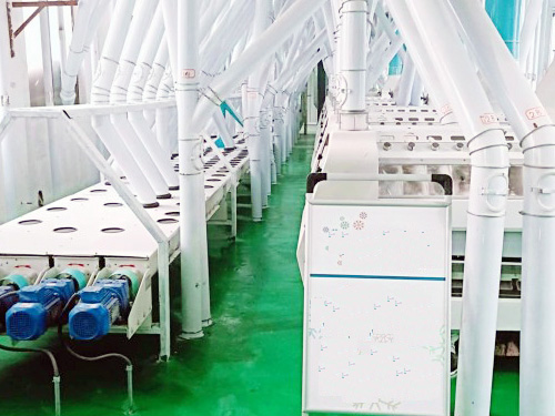 在倉儲、干法清理,制粉及面粉配粉的各道工序完全自動化,日加工小麥200噸的面粉加工生產(chǎn)線。